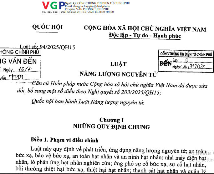 Ngày 27/6/2025, tại Kỳ họp thứ 9, Quốc hội khóa XV đã thông qua Luật Năng lượng nguyên tử số 94/2025/QH15, có hiệu lực từ ngày 01/01/2026 và thay thế Luật Năng lượng nguyên tử số 18/2008/QH12